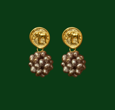 Unsere Ohrringe mit Elefanten-Ornament und pink-lila Clusterperlen sind ein echtes Statement. Oben ein stilisiertes Elefanten-Detail in edlem Gold mit darunter hängenden Clusterperlen in dezenten Pink- und Lilatönen.
