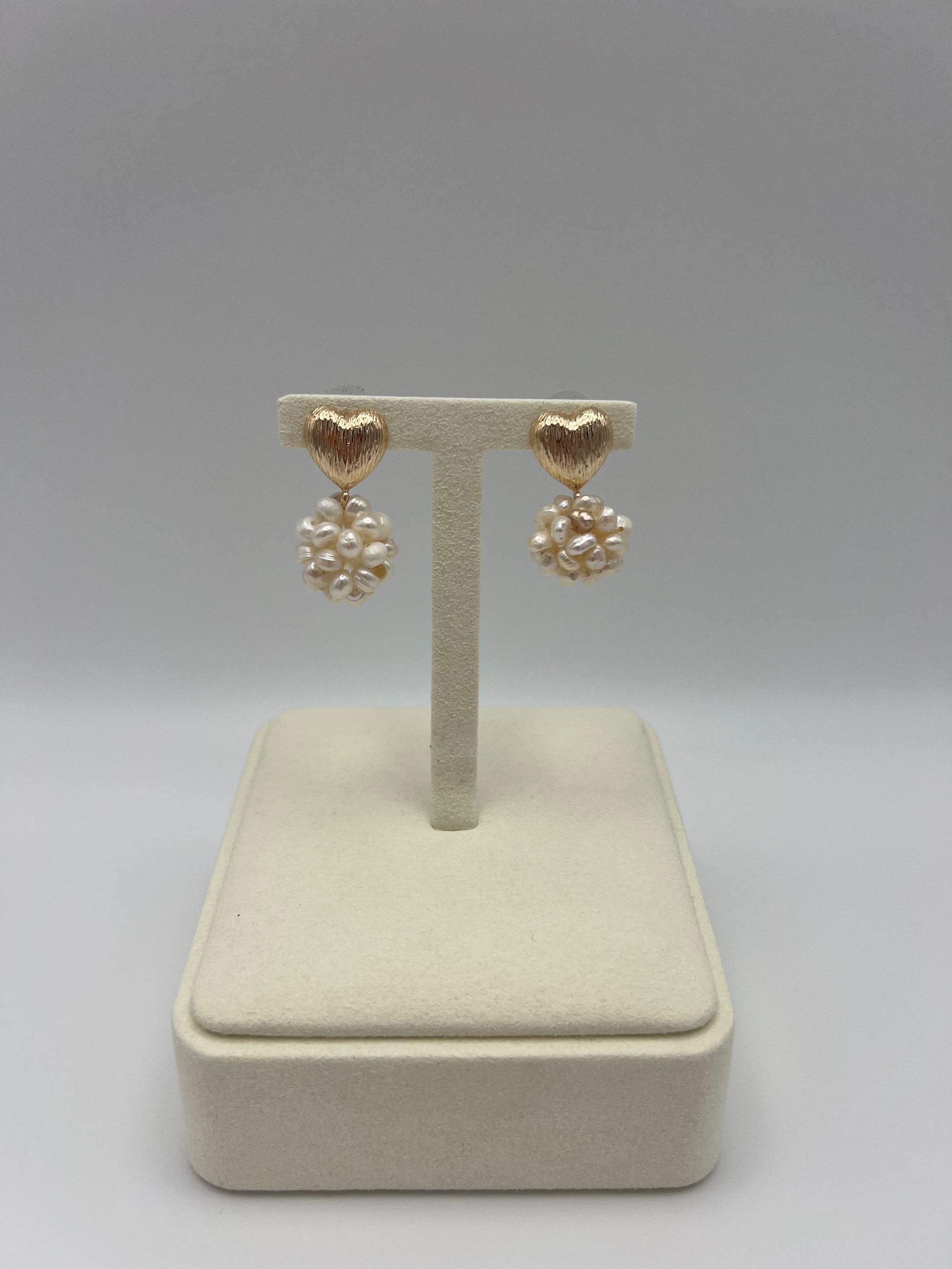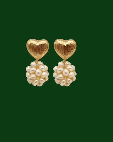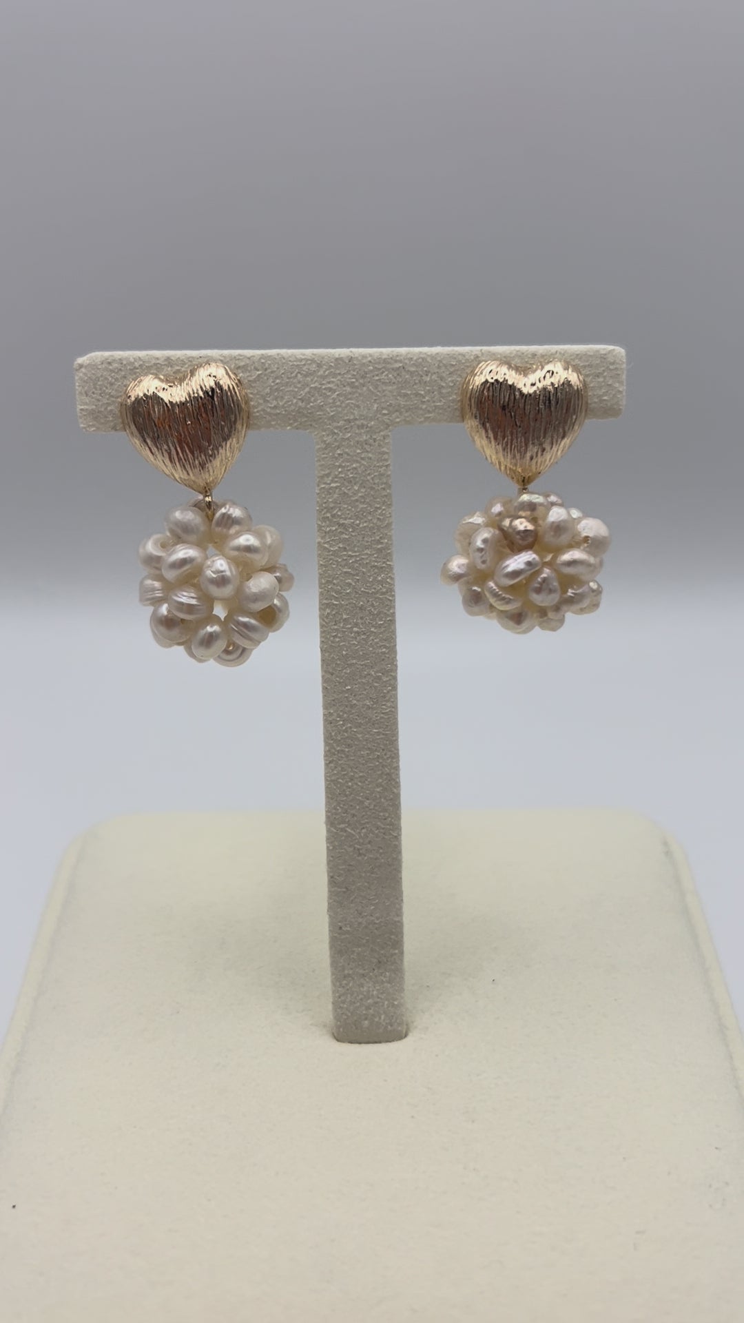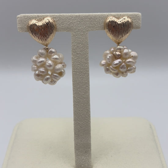 Diese Ohrringe mit schraffiertem Herz und Clusterperlen sind der Inbegriff moderner Romantik. Das schraffierte Herz in 18 Karat Vergoldung und darunter eine Clusterperlentraube.