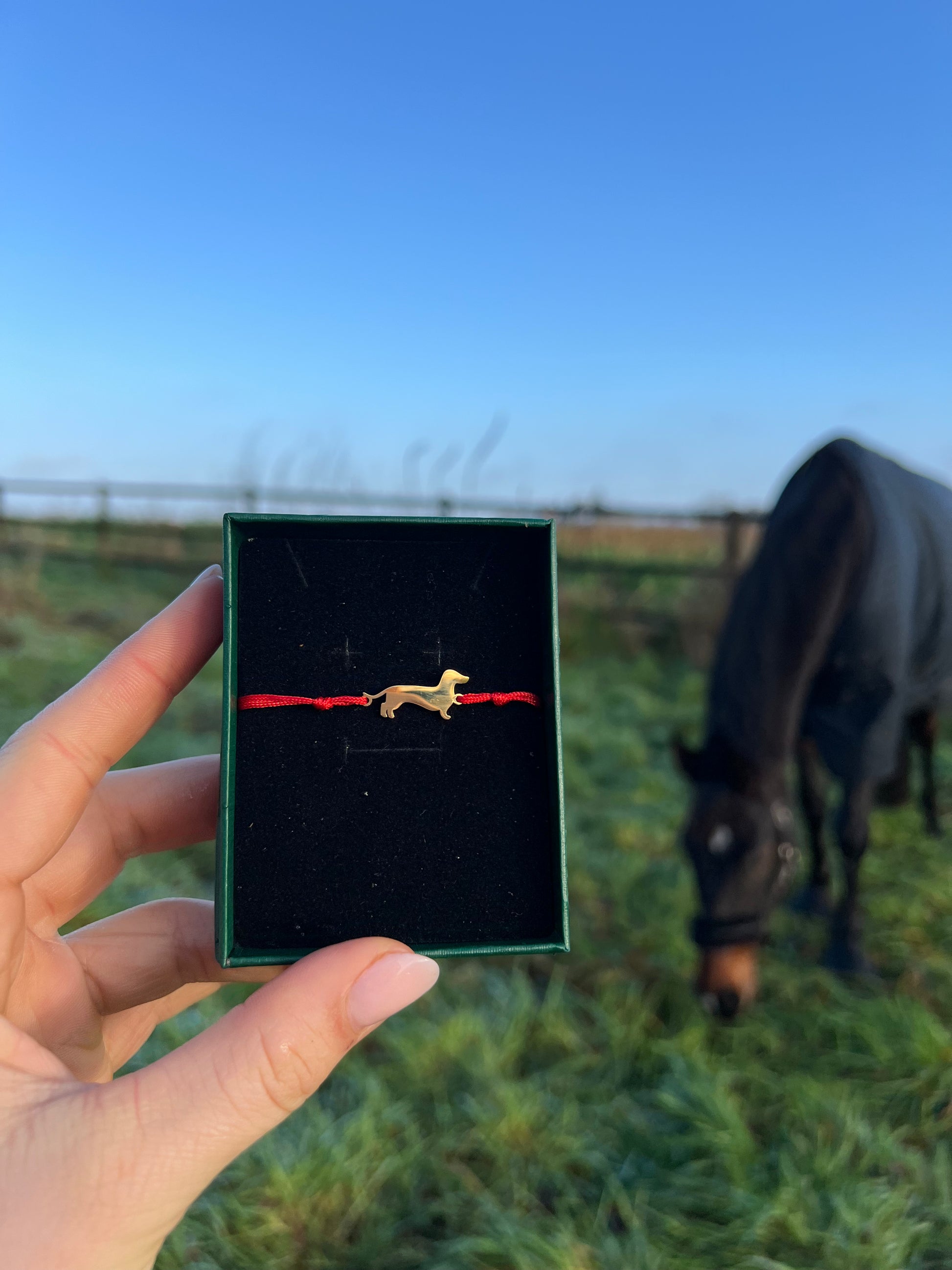 Die wunderschöne, stilvolle Dackelsilhouette schmückt ein rotes Armband. In der Größe variierbar. Das perfekte Armband für jeden Hunde- und besonders Dackelliebhaber.